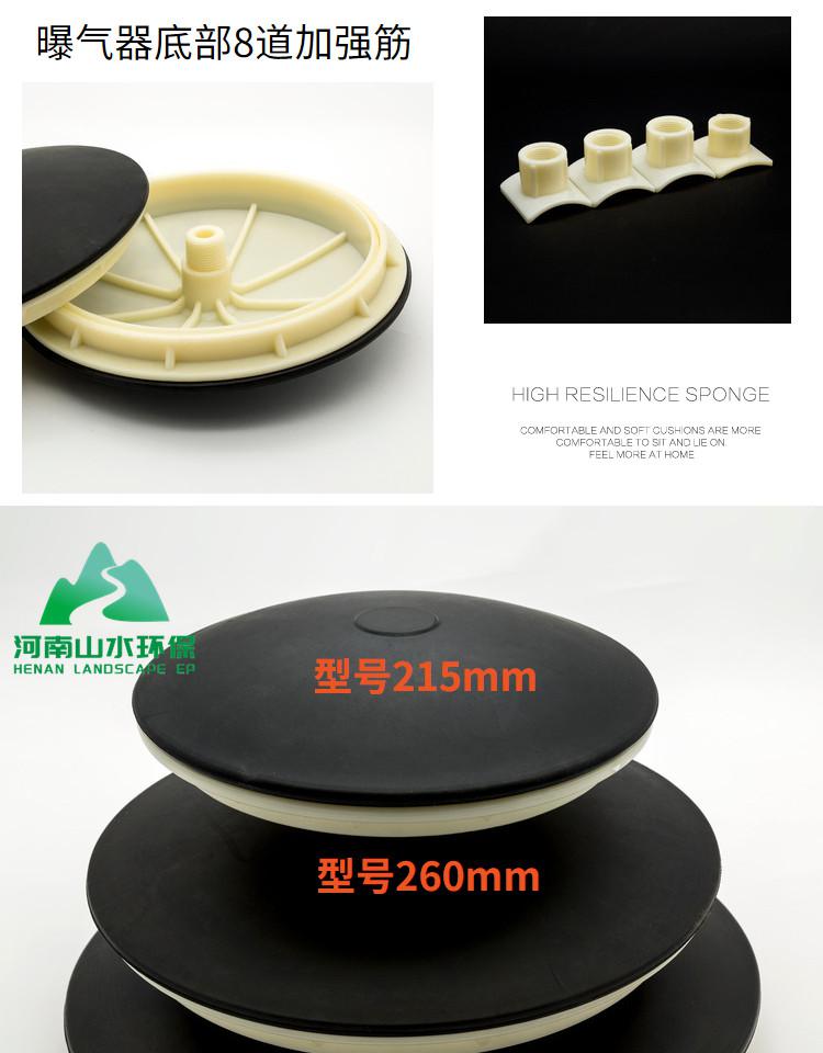 (1)橡膠膜片:選用進口優質橡膠原料,根據曝氣工況需求量身定制材質成分與配比,具有良好的物理、化學性能,有效防止膜片收縮、硬化與老化,延長產品壽命。