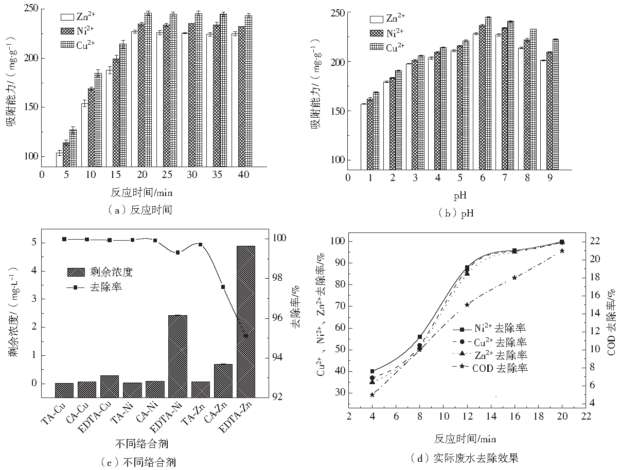 圖4(d)表示的是實(shí)際廢水的處理效果。實(shí)驗(yàn)結(jié)果表明,當(dāng)吸附時(shí)間達(dá)到20 min時(shí),Cu2+, Ni2+, Zn2+去除率分別達(dá)到99.95%、99.94%、99.84%,剩余濃度分別為0.07、0.09 和0.34 mg·L−1,均在國(guó)家排放標(biāo)準(zhǔn)以下(Cu 0.3 mg·L−1,Ni 0.1 mg·L−1,Zn 1.0 mg·L−1)。此外,PADTC還能去除21%的COD (廢水初始COD為301.25 mg·L−1,反應(yīng)過(guò)后COD為 237.99 mg·L−1),這可能是因?yàn)楦叻肿泳酆衔镏g的吸附架橋作用去除了廢水中的部分有機(jī)物。