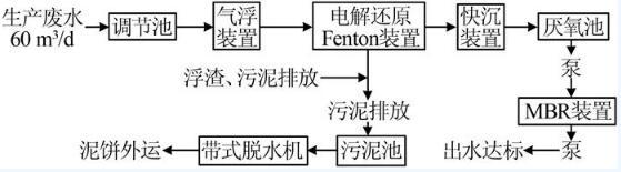 將原有調(diào)節(jié)池與缺氧池合并為新的調(diào)節(jié)池,在新調(diào)節(jié)池內(nèi)設(shè)置鼓風(fēng)曝氣系統(tǒng),在充分調(diào)節(jié)水質(zhì)水量的同時(shí),保證油類(lèi)及懸浮物等污染物不會(huì)上浮;出水經(jīng)地上泵提升至氣浮裝置,在氣浮裝置內(nèi)進(jìn)行部分加壓溶氣氣浮預(yù)處理,去除廢水中大部分油類(lèi)污染物、大量懸浮物SS等,以減少后續(xù)電解還原Fenton電極板清洗頻次,并降低后續(xù)處理負(fù)荷。氣浮裝置出水自流進(jìn)入電解還原Fenton裝置,通過(guò)外加電場(chǎng)作用該廢水,由于該廢水中含Cl-質(zhì)量濃度高、導(dǎo)電性良好,外加電場(chǎng)后,聯(lián)合化學(xué)藥劑共同作用,化學(xué)反應(yīng)劇烈,可對(duì)廢水中大分子有機(jī)污染物進(jìn)行氧化分解;電解還原Fenton裝置出水自流進(jìn)入快沉裝置,通過(guò)調(diào)節(jié)pH使大量污泥沉淀;快沉裝置上清液自流進(jìn)入?yún)捬醭兀ㄟ^(guò)厭氧微生物的新陳代謝作用去除廢水中難降解的有機(jī)污染物;厭氧池出水經(jīng)地上泵提升至MBR裝置,通過(guò)好氧微生物的作用進(jìn)一步降解廢水中的有機(jī)污染物,同時(shí)利用MBR膜組件的截留功能維持MBR裝置內(nèi)較高的污泥濃度,以增強(qiáng)系統(tǒng)的耐沖擊負(fù)荷能力;MBR裝置出水經(jīng)出水泵抽至出水桶,達(dá)標(biāo)后納管排放。