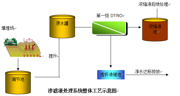 調(diào)節(jié)池滲濾液經(jīng)泵提升至滲濾液原水儲罐,進行pH值調(diào)節(jié)、砂濾器、保安過濾器等簡單預(yù)處理后,進入單級DTRO,經(jīng)DTRO處理后產(chǎn)生的透過液排放,DTRO的濃水排至濃縮液儲池等待進一步處理DTRO工藝整體處是流程如下圖所示: